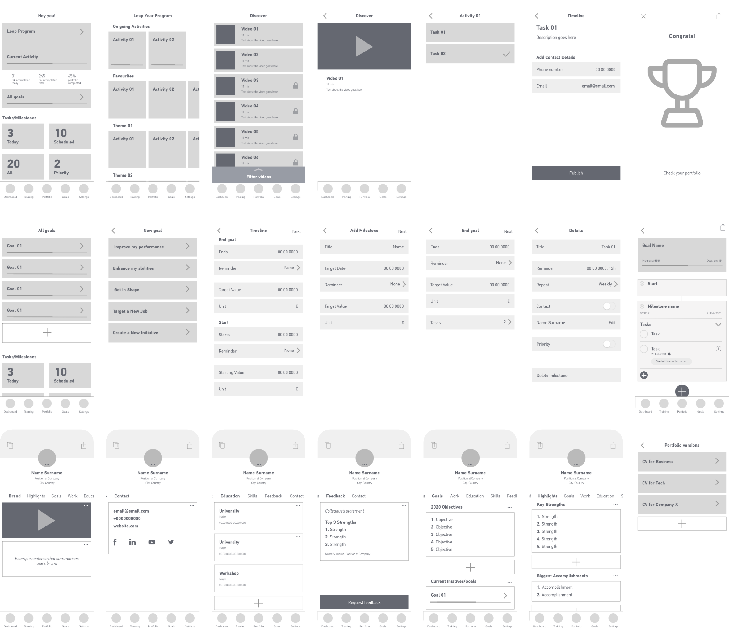 Most CVs follow the same structure, so after analysing multiple examples I came to a selection of sections, like education skills and contacts, and an extra section dedicated to the user’s accomplishments on the app. Here the user not only shows their achieved goals but also how they did it, giving a peak to their way of thinking and processes taken.
