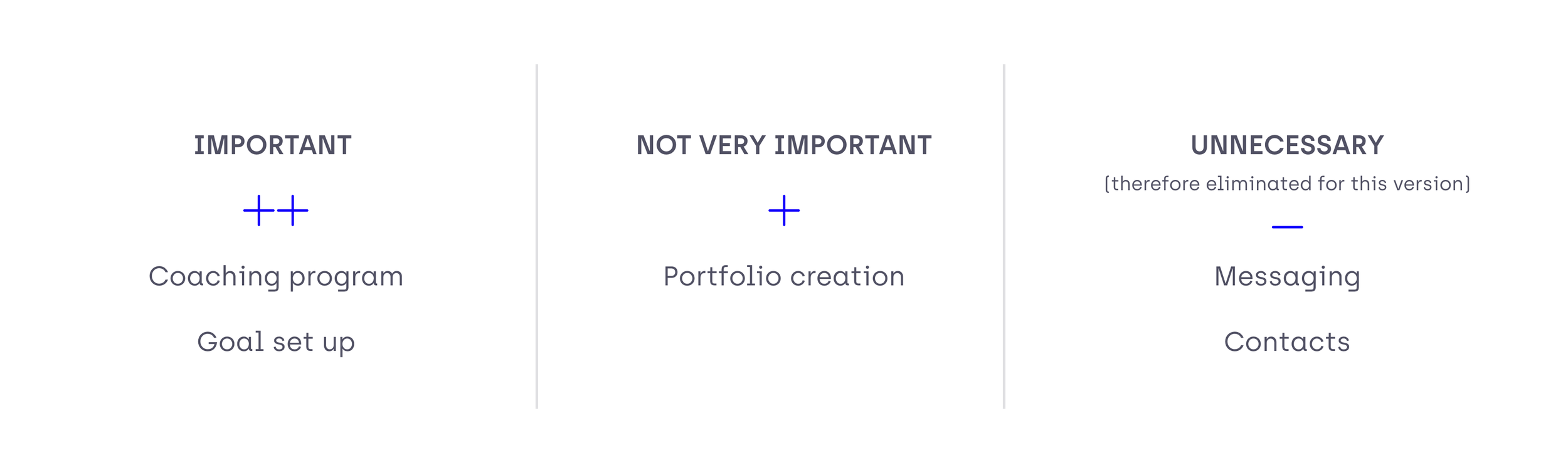 We ranked these features by importance and eliminated those diluting from the main goals of the app in order to support new users with a clear perspective on how the app fits into their aims and routine.
