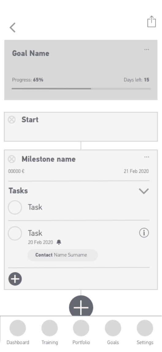 The way I saw this section was as a timeline built with modular blocks. Therefore this screen is composed by containers with information that are connected through a continuous line. The blocks can have different purposes and are customisable. The user can add or remove containers through this line. Once they build it, they can follow it one step at the time until they finally reach their goal.
